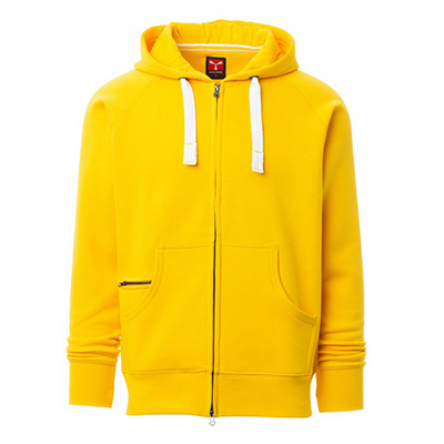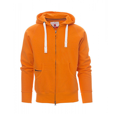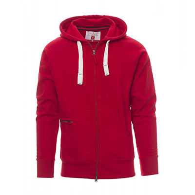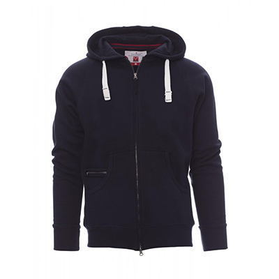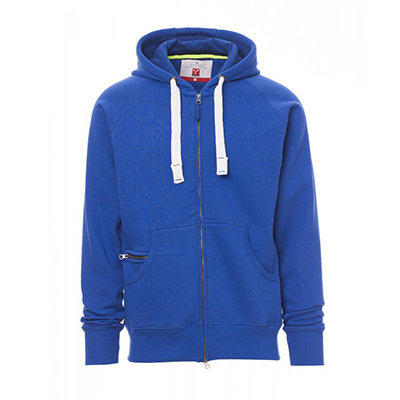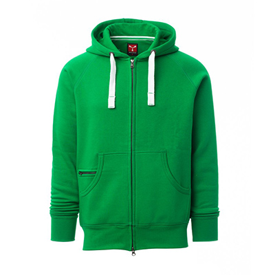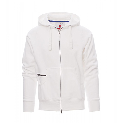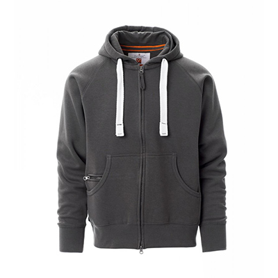 Felpa da uomo, zip intera SBS coperta, in plastica con doppio cursore in metallo, cappuccio con due cuciture, coulisse bianca in corda con cuciture in tinta con la felpa e anelli in metallo, manica raglan, tasche a marsupio con taschino con zip, polsini e vita in costina elasticizzata. Cuciture rinforzate.