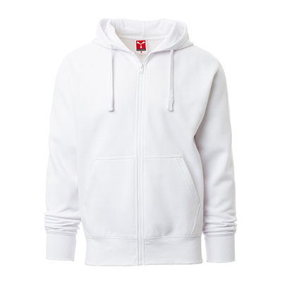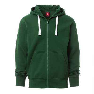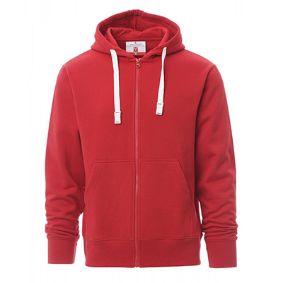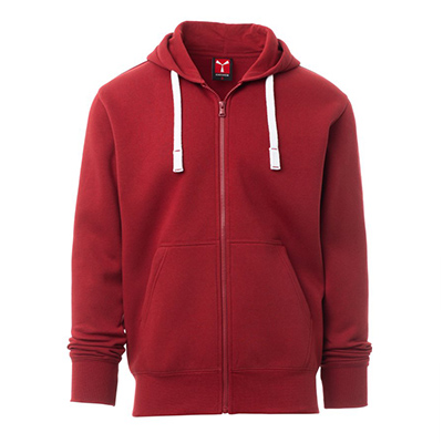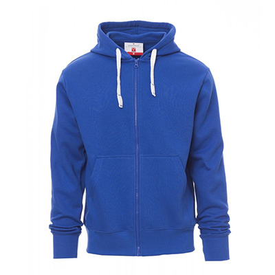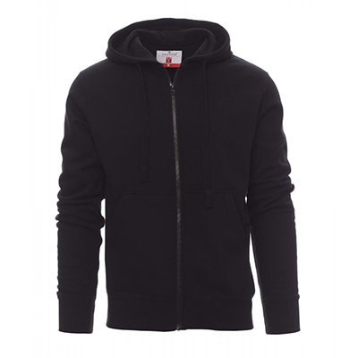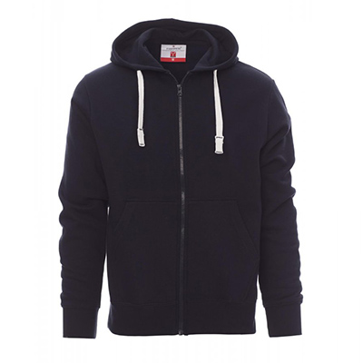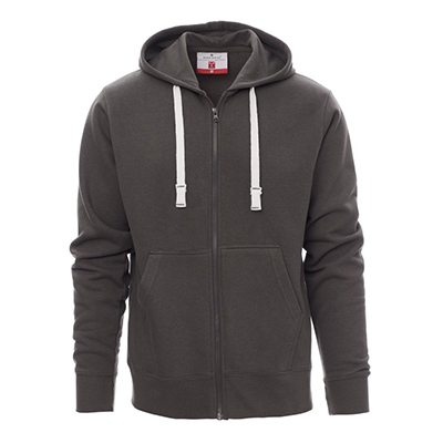 Felpa da uomo, zip intera in plastica a cursore singolo in metallo, cappuccio, coulisse in corda con cuciture in tinta con la felpa, manica a giro, tasche a marsupio, polsini e vita in costina elasticizzata. Cuciture rinforzate, nastro di rinforzo interno collo in tinta.