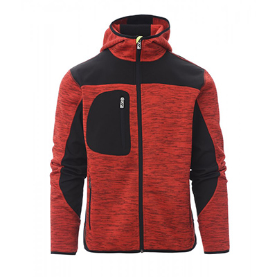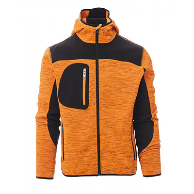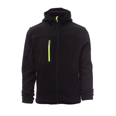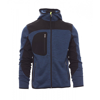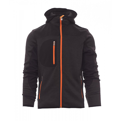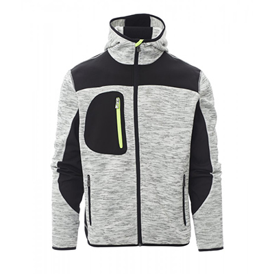 Maglia tecnica con inserti in soft-shell a contrasto, zip nastrata, cappuccio sagomato con due cuciture. Bordino rifinito su polsini e fondo, due tasche laterali con zip, una tasca al petto.
