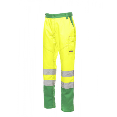 Pantalone da uomo, multi stagione, in alta visibilità con bande riflettenti, elastici laterali e passanti in vita, chiusura con zip e bottone in plastica, due tasche anteriori a taglio classico, tasca laterale LOCK SYSTEM, porta metro, due tasche posteriori una aperta e una con patta e velcro. Cuciture a contrasto, cavallo e interno gamba a triplo ago.