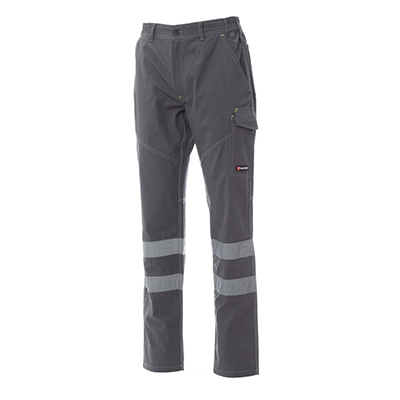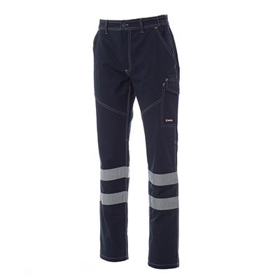 Pantalone unisex, estivo, con bande riflettenti in cat.1, elastici laterali e passanti in vita, chiusura con zip e bottone in plastica, due tasche anteriori a taglio classico, una tasca laterale LOCK SYSTEM, un porta metro, due tasche posteriori una aperta e una con patta e velcro, inserti ed impunture a contrasto, bande reflex su tasca posteriore, cuciture triple. Impunture e cuciture in tono, con travette in contrasto giallo fluo, per il colore Total Black.